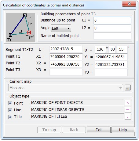 Building parameters of point Т3 group is intended for input of distance from points of basis up to created picket. The picket point can be at the left or to the right of basis of building, therefore by means of the dropping-down list it is necessary to set a type of an angle - left or right. At filling of Name of built point field the specified information is placed into semantics of created point object. Put a tick into an element Do you want to save line? for creation of the linear object connecting points of basis with picket point. The second group displays coordinates of points, length and a direction angle of base of building. Point Т1 and Point Т2 fields contain coordinates of points of a base line (reference line), and Point Т3 field - coordinates of picket. Coordinates of picket are calculated automatically at filling fields: Distance up to point (Building parameters of point Т3 group). Current map group is intended for a choice of an electronic map on which the objects will be created. The edited map can be chosen from the list of the open maps, or by means of the button «…» to add an existing user map. Object type group is intended for a choice of a conventional symbol from the classifier of an edited map for created point and linear objects. To map button is intended for creation on an edited map of a picket point and the lines connecting points of basis with a picket point (if the tick in an element is put Do you want to save line? in Building parameters of point Т3 group). The button becomes accessible after input of initial data and automatic calculation of coordinates of picket. Back button is intended for a cancelling of operation on creation of objects on an edited map. For copying into the clipboard of value of an angle it is necessary on any of fields of corresponding components: Direction angle to cause the contextual menu by the right button of the mouse and to choose a line Copy angle . Value of an angle will be copied into the clipboard in a format: degrees minute second, through blanks.